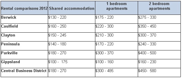 Tersedia disemua kampus monash Australia kecuali kampus Parkville, semua tipe kamar adalah single dengan harga berkisar antara AUD 2,996 sd AUD 4,410 per 20 minggu (minimum booking)