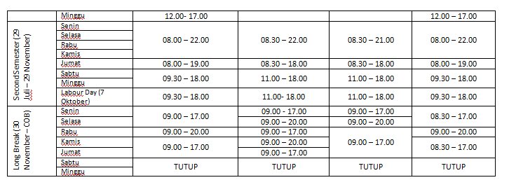 Udah tau kan ya sekarang tempat – tempatnya.. sekarang coba kita perhatiin waktu pelayanannya masing – masing. Perpustakaan Flinders akan buka sepanjang masa tahun pembelajaran, bahkan hari sabtu dan minggu pada masa perkuliahan aktif, di bawah ini akan dikasih lengkap jam bukanya kampus flinders, perhatikan baik – baik. Jangan sampe nanti kamu datang tapi ternyata hari tersebut malah tutup atau udah mau tutup. 😀 soalnya waktu maksimal proses peminjaman itu 15 menit sebelum jam tutup looh, jadi catet baik – baik..