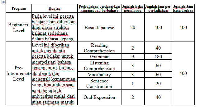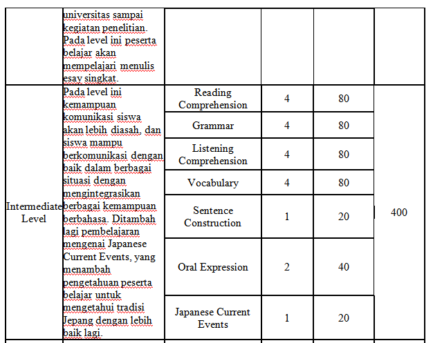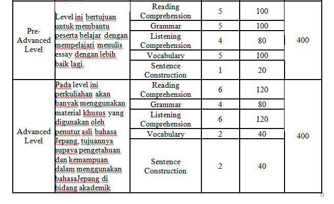Tiap level punya fokus belajar tersendiri looh, contohnya di beginners level, pembelajaran yang dikasih itu adalah kemampuan dasar dalam membuat kalimat dalam bahasa jepang. Kemudian di level berikutnya fokus kemampuan bahasa yang diberikan itu ada Reading Comprehension, Grammar, Listening Comprehension, Vocabulary, Sentence Construction, dan juga Oral Expression. Naaah, untuk level selanjutnya, di Intermediate Level ada tambahan fokus pembelajarannya yaitu Japanese Current Events. Untuk dua level berikutnya, fokus kemampuan berbahasanya sama yaitu Reading Comprehension, Grammar, Listening Comprehension, Vocabulary, dan Sentence Construction.