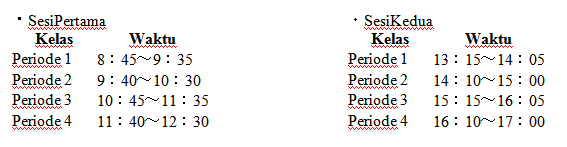 Ada dua sesi untuk setiap level per harinya, sesi pertama dimulai pada kelas pertama pada pukul 08:45 – 09:35 dan berkahir pada kelas ke-empat pada pukul 12:30. Kemudian sesi kedua, kelas pertama akan dimulai pukul 13 :15 – 14:05 dan berakhir dikelas keempat pada pukul 16:10 – 17:00.