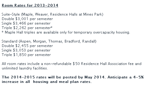Buat kalian yang udah diterima di Mines, kalian berkesempatan buat tinggal di Mines Residence Halls yang berlokasi di luar kampus. Buat pergi kampus sendiri bisa dengan jalan kaki atau bersepeda. Dengan tinggal di Residence Halls juga bisa ikutan berbagai event yang diadakan seperti bowling night, community service, dinner dan acara olahraga lainnya. Selain Residence Halls, Mines juga menyediakan apartment yang berlokasi di Mines Park.