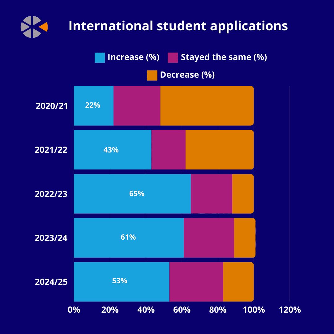 Survei yang dilakukan pada 17 Juni – 13 Juli 2024 ini menemukan peningkatan aplikasi terbesar pada siswa dari Ghana (62%), Nepal (53%), India (47%), Nigeria (46%), dan Bangladesh (40%).