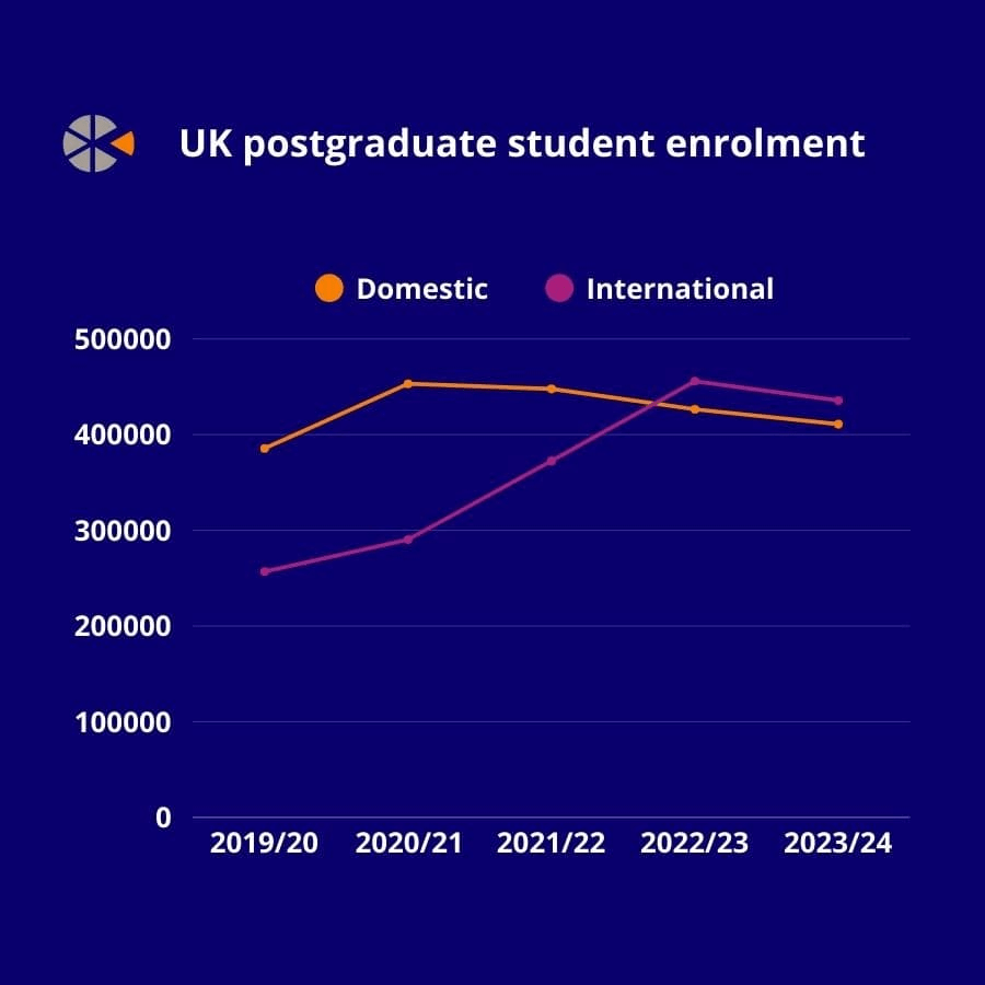 Meskipun terjadi penurunan secara keseluruhan, mahasiswa internasional menyumbang lebih banyak pendaftaran pascasarjana daripada mahasiswa domestik, dengan hampir 60% mahasiswa dari luar negeri menempuh studi pascasarjana.