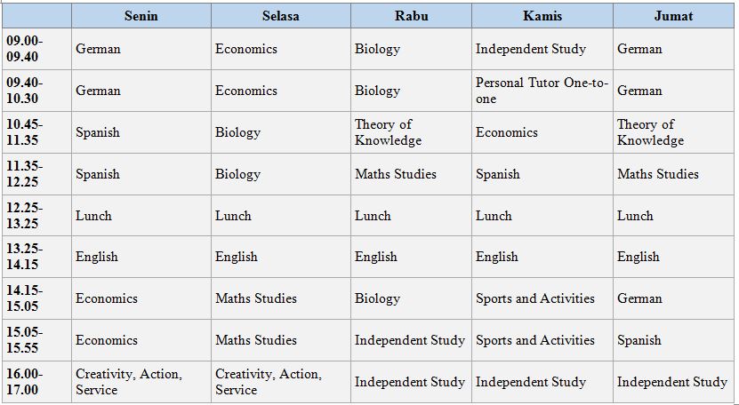 Siswa akan mengikuti enam pelajaran yang dirancang khusus untuk memastikan mereka agar memiliki wawasan luas di bahasa, pelajaran sosial, pelajaran eksperimental, matematika, dan seni. Sebagai tambahan, program ini memiliki tiga inti persyaratan yang menantang siswa untuk menerapkan pengetahuan dan pemahaman yang telah mereka dapati, yaitu: 1. Extended Essay Extended essay adalah sebuah proyek penelitian yang dikerjakan secara mandiri dengan melakukan pembelajaran secara mendalam mengenai suatu subject yang spesifik. Penelitian tersebut dikemukakan dalam essay yang berisi 4000 kata. Hal ini akan menjadi unsur yang penting, karena:- akan menjadi persiapan praktis untuk jenis penelitian sarjana yang dibutuhkan pada tingkat tersier